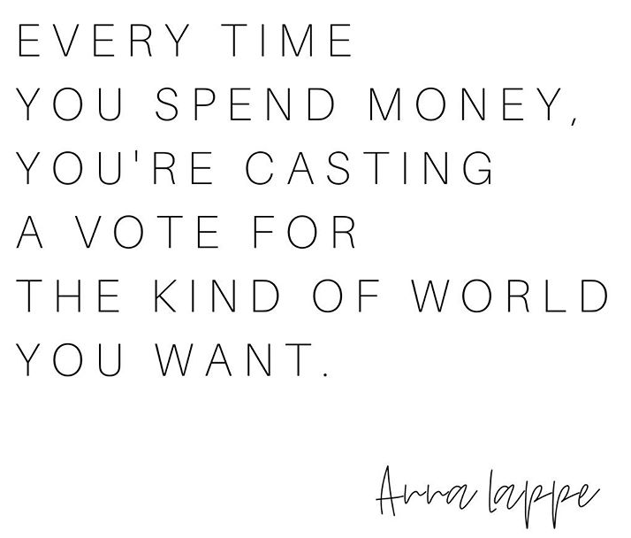 Ouch. Every dollar casts a vote for the world you want. I can’t say I’ve really considered it on a broad level. There are a few companies that I refuse to buy from because of what they stand for, but I have only made those decisions as something comes to my attention. I have not actively investigated the brands and stores that I use every day.